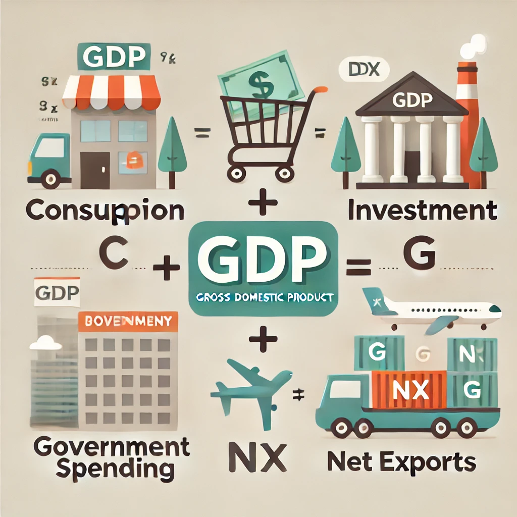 GDP는 크게 소비(C), 투자(I), 정부 지출(G), 순수출(NX = 수출 - 수입)로 구성됩니다. 이를 수식으로 표현하면 다음과 같습니다.